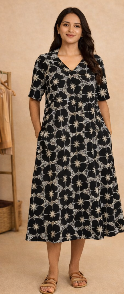 Crafted in breathable pure cotton hakoba, the Halo Bloom Pocket Dress blends timeless black with delicate ivory embroidery – creating a look that’s soft, striking, and effortlessly elegant. Designed for everyday comfort with a boutique finish, this piece features a graceful collar neckline, flattering silhouette, and beautifully detailed sleeves, making it perfect for long days that move into relaxed evenings.