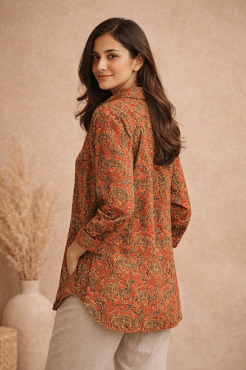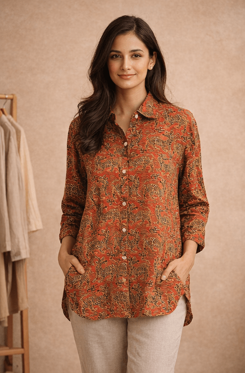 Crafted in soft premium cotton, this longline shirt features a rich rust base adorned with an intricate tiger and foliage inspired print. The relaxed flattering silhouette, full sleeves and classic button-down structure create a timeless form and gently curved hem add modern practicality.